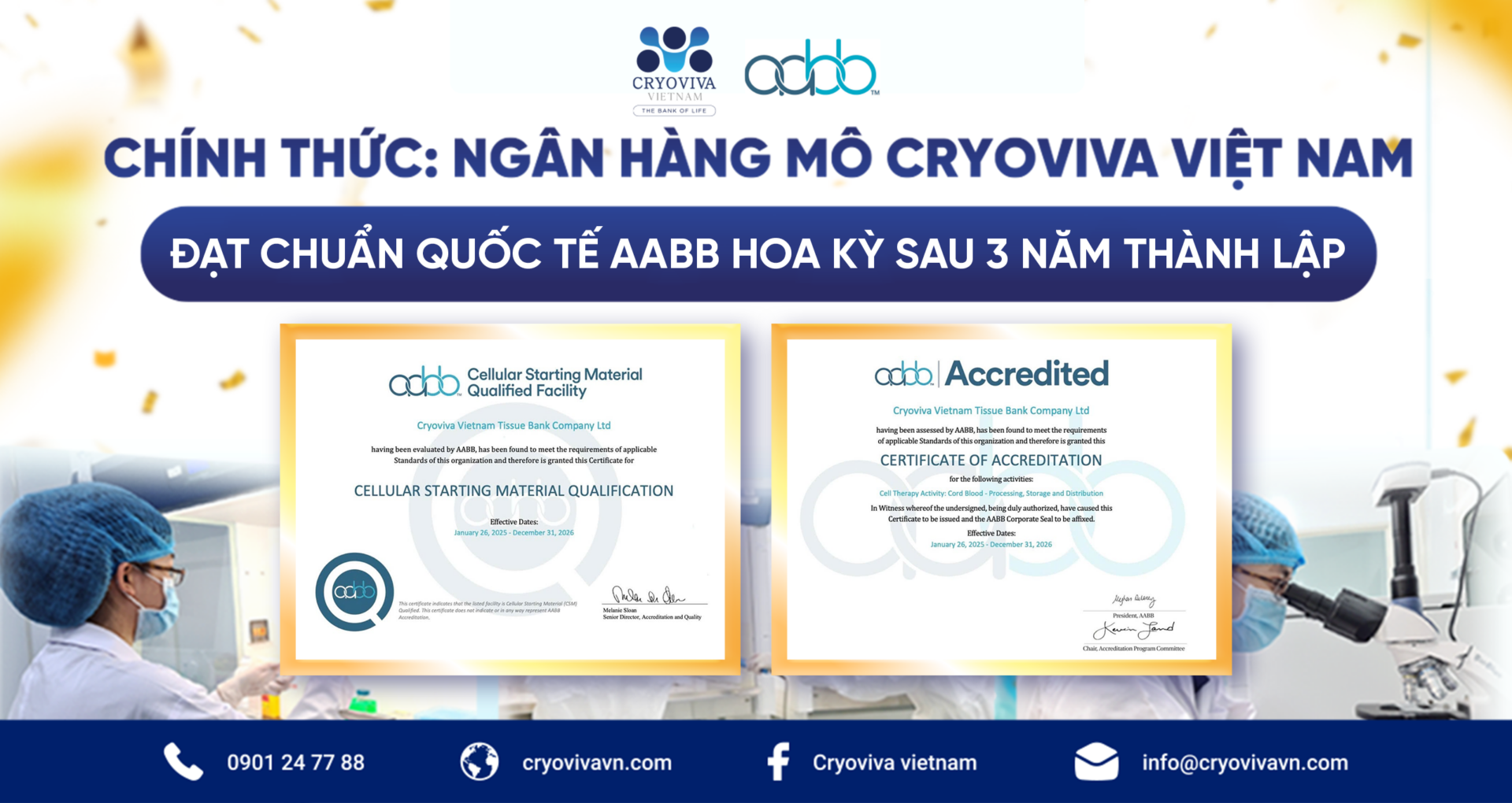 Sau hơn 2 năm hoạt động, Cryoviva Việt Nam tự hào trở thành Ngân hàng mô đạt chứng nhận quốc tế AABB – Tiêu chuẩn vàng trong lĩnh vực lưu trữ tế bào gốc và các sản phẩm sinh học. Chứng nhận này thể hiện rằng Cryoviva Việt Nam tuân thủ nghiêm ngặt quy trình từ thu thập, xử lý đến lưu trữ, đảm bảo chất lượng mẫu tế bào gốc luôn ở mức tối ưu