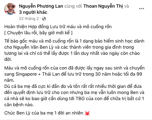 Chị Phương Lan chia sẻ thêm trong bài viết của mình Hoàn thiện Hợp đồng Lưu trữ máu và mô cuống rốn [ Chuyện lâu rồi, bây giờ mới kể ]. Tế bào gốc máu và mô cuống rốn là 1 dạng bảo hiểm sinh học dành cho Nguyễn Văn Ben Lỳ và các thành viên trong gia đình trong tương lai và chỉ có thể lấy được 1 lần duy nhất vào ngày còn chào đời.”