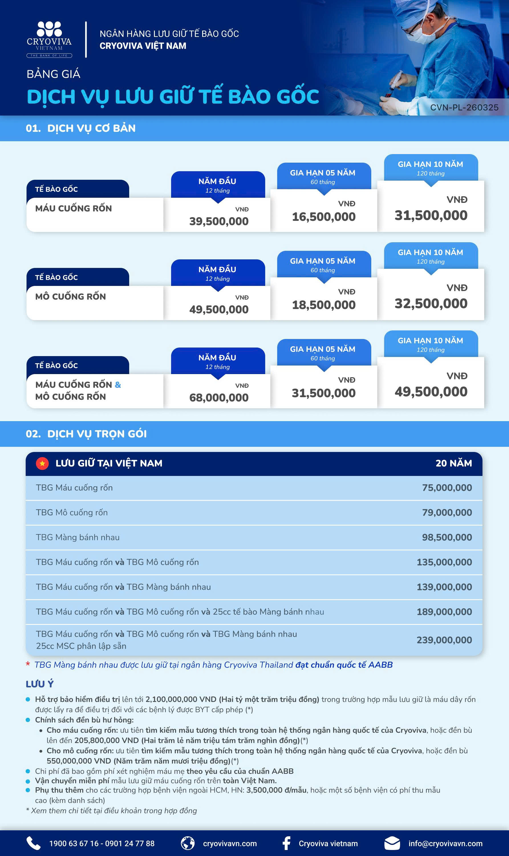 Bảng giá dịch vụ lưu trữ tế bào gốc Cryoviva Việt Nam