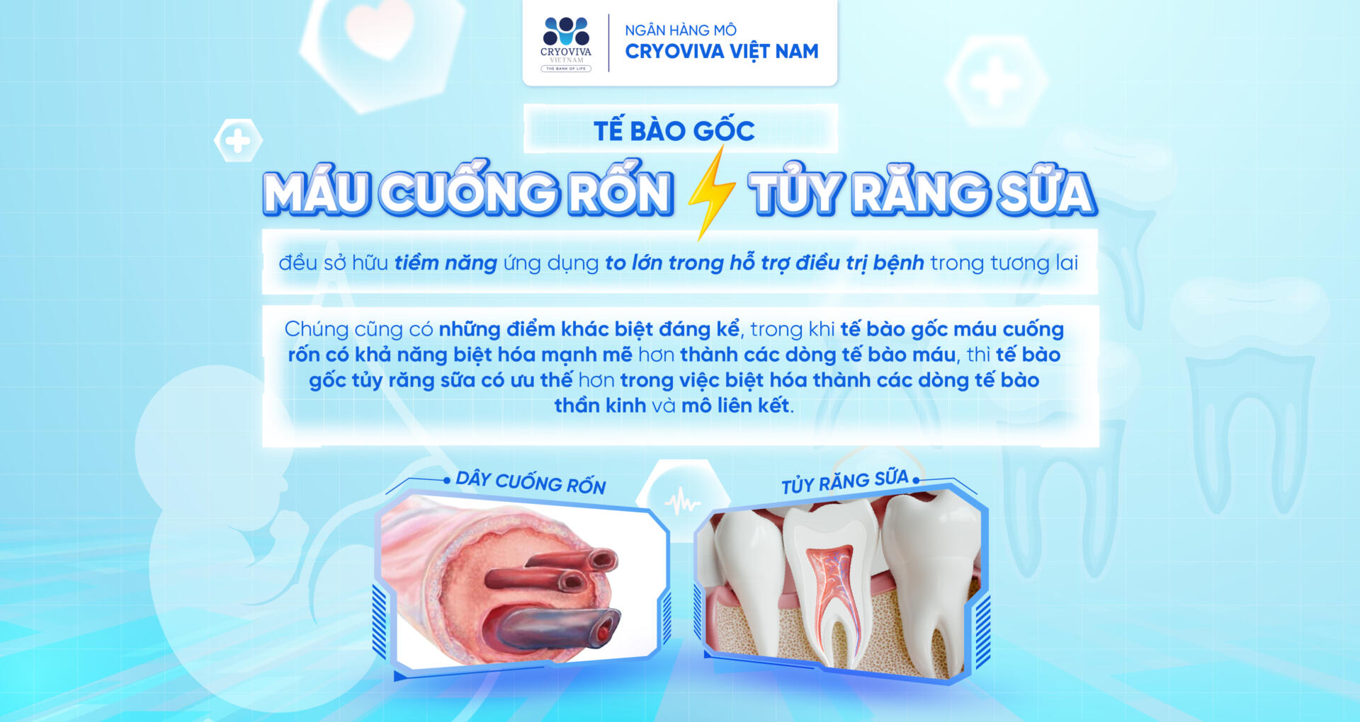 Tế bào gốc máu cuống rốn và tế bào gốc tủy răng sữa đều sở hữu tiềm năng ứng dụng to lớn trong hỗ trợ điều trị bệnh trong tương lai. Cả hai loại tế bào này đều có khả năng tái tạo và biệt hóa thành nhiều dòng tế bào khác nhau, mở ra cơ hội trong điều trị các bệnh lý về máu, thần kinh, tim mạch và nhiều lĩnh vực y học tái tạo khác. Tuy nhiên, việc lưu trữ tế bào gốc máu cuống rốn được xem là một “cơ hội vàng”, bởi lẽ số lượng tế bào gốc thu thập từ cuống rốn thường dồi dào hơn so với tủy răng sữa, từ đó tăng khả năng ứng dụng và hiệu quả trong điều trị.